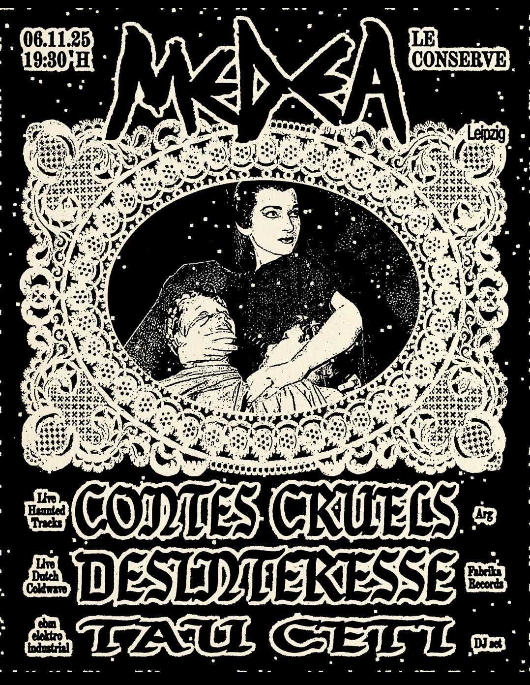 Berlin-based ghostwave duo Contes Cruels crafts a night-black blend of haunting rhythms, analog synths, and icy textures. Their set weaves together material from the debut EP Séance with unreleased tracks from their upcoming album, creating a danceable ritual of spectral atmospheres and cold lyrics.
